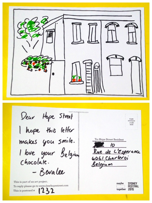 Cher Hope Street. J’espère que cette lettre vous fait sourire. J’adore vos chocolats belges. Bevalee.