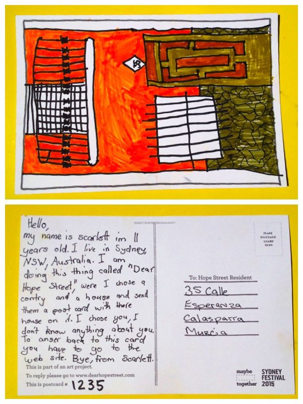 Hola. Mi nombre es Scarlett. Tengo 11 años. Vivo en Sydney NSW, Australia. Estoy haciendo esta cosa llamada “Querida calle esperanza” donde elijo un país y una casa y les envío una postal con su casa en ella. Yo le he elegido a usted. No sé nada sobre usted. Para responder a esta postal tiene que ir al sitio web. Adiós, Scarlett.