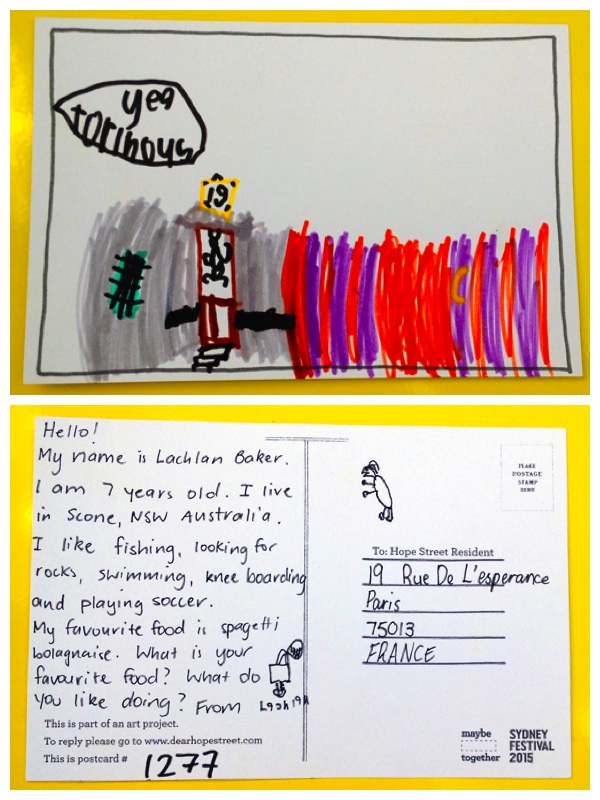 Salut! Mon nom est Lachlan Baker. J’ai 7 ans. J’habite à Scone, Australie. J’aime la pêche, chercher des roches, la natation, nager et jouer au soccer. Mon repas preferé est : pâtes à la bolognaise. Quel est votre repas préféré ? Qu’aimez-vous faire ? De Lachlan.