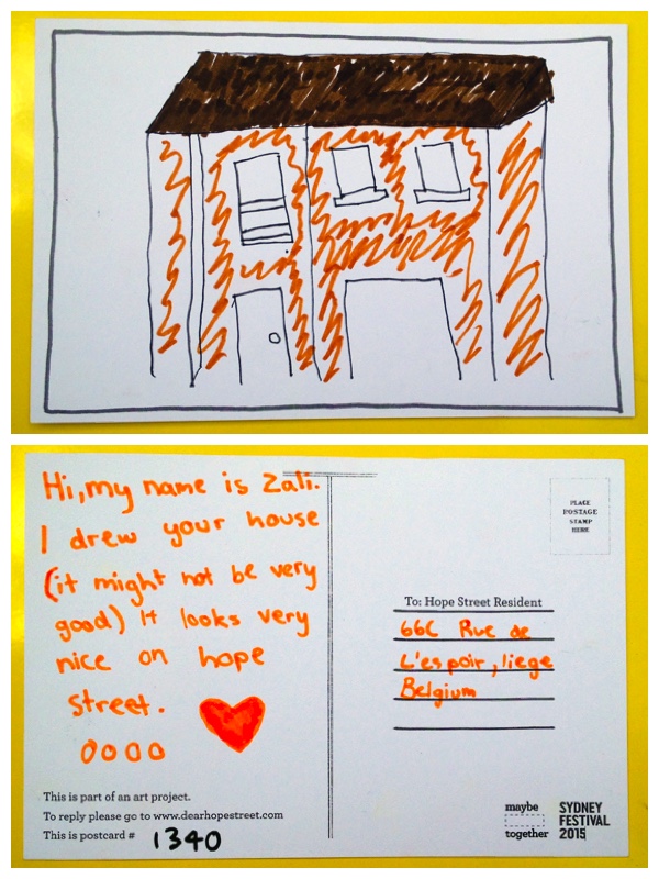 Translation: Salut, mon nom est Sonia. J’ai dessiné votre maison (c’est ne pas si jolie) elle est très jolie sur Hope Street.