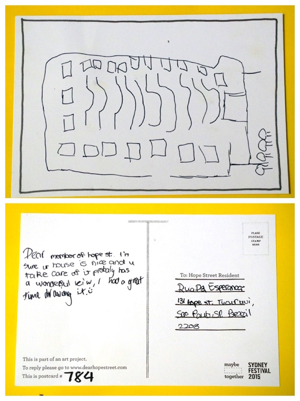 Translation: Caro membro da Hope St. Eu tenho certeza que sua casa é legal e você cuida dela. Provavelmente tem uma vista maravilhosa. Eu me diverti muito desenhando ela.