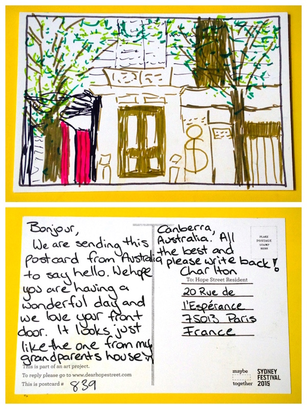 Translation: Bonjour, nous vous envoyons cette carte postale de l’Australie pour vous saluer. Nous espérons que vous passez une bonne journée. Nous aimons votre porte d’entrée. Elle semble la porte de la maison de nos parents.