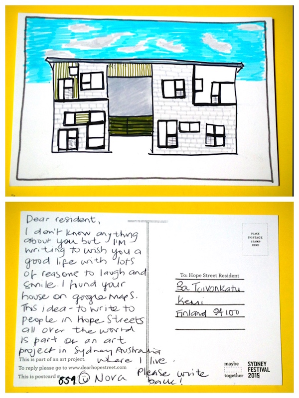 Hyvä asukas. En tiedä sinusta mitään, mutta toivotan sinulle hyvää elämää, jossa on paljon aiheita nauruun ja hymyyn. Löysin talosi Google Maps:in avulla. Tämä idea – että kirjoitetaan ihmisille ympäri maailmaa, perustuen siihen että he asuvat “Hope Streetillä, Toivonkadulla jne.”, on osa taideprojektia kotikaupungissani Australian Sydneyssa. Kirjoitahan takaisin.
