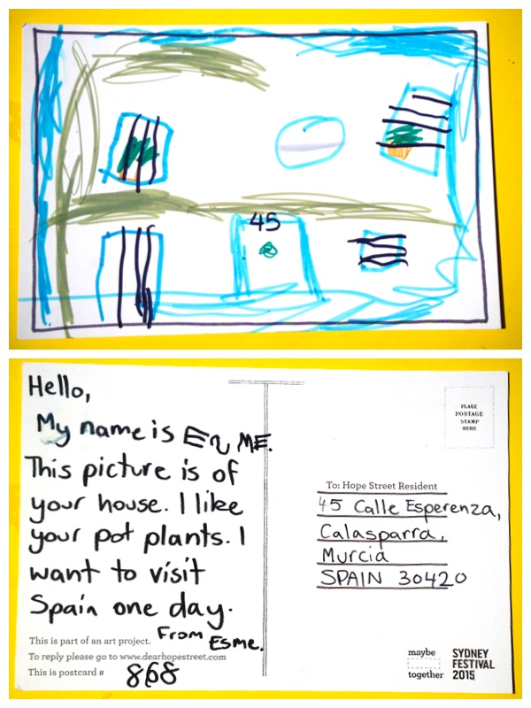 Hola, mi nombre es Esme. Este dibujo es de su casa. Me gustan sus macetas. Quiero visitar España algún día. Esme.