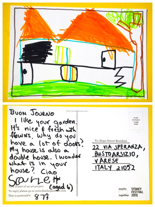 Translation: Mi piace il tuo giardino. E ‘ bello e fresco con fiori. Perché hai un sacco di porte? La mia casa è anche una casa doppia. Mi chiedo che cosa c’è nella tua casa? Ciao. Scarlet (6 anni di età)