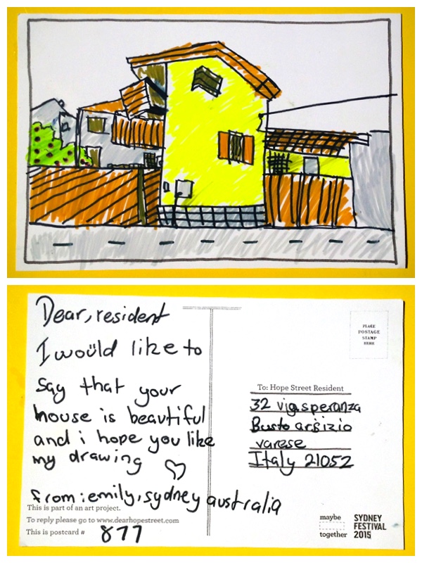 Vorrei dire che la vostra casa è bella e spero che vi piaccia il mio disegno. Da Emily, Sydney, Australia.