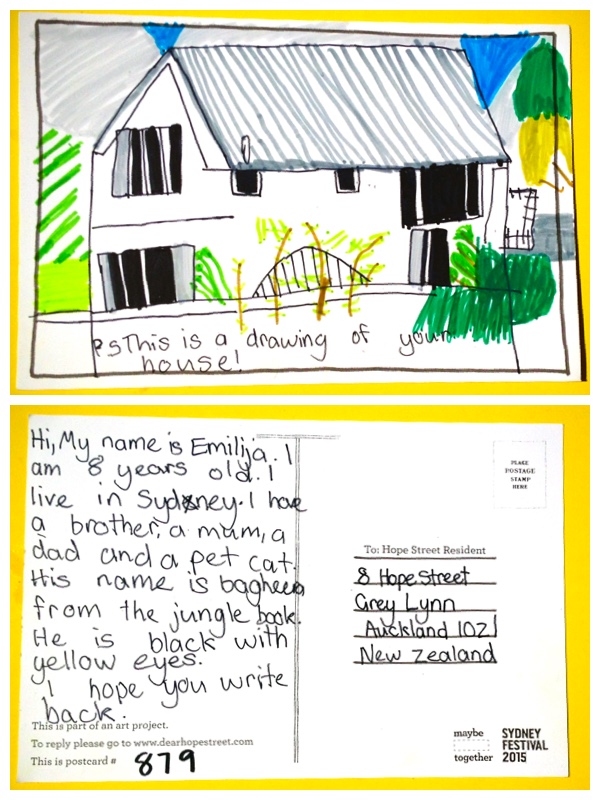 Thanks very much for your card, Emilija! It really does look so much like my house. I’ve now stuck you card to my fridge so that I can see it every day. I’ve been to Sydney several times and like travelling on the trains and the ferries. I can see why you called your cat Bagheera because he’s black with yellow eyes just like Bagheera the panther. My cat is a tabby called Toby. Best wishes for your future. – John