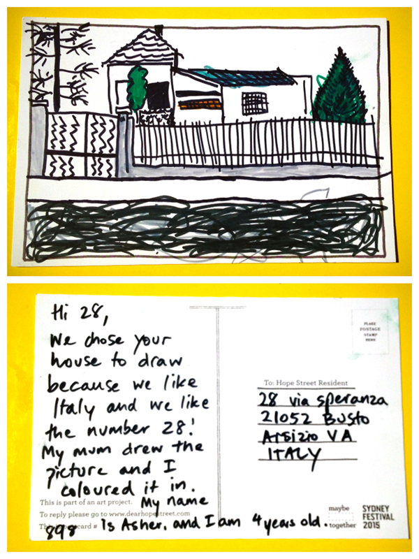 Translation: Ciao 28, abbiamo scelto la tua casa per disegnare perché ci piace l’Italia e ci piace il numero 28! La mia mamma ha disegnato l’immagine ed io l’ho dipinta. Il mio nome è Asher e ho 4 anni di età.
