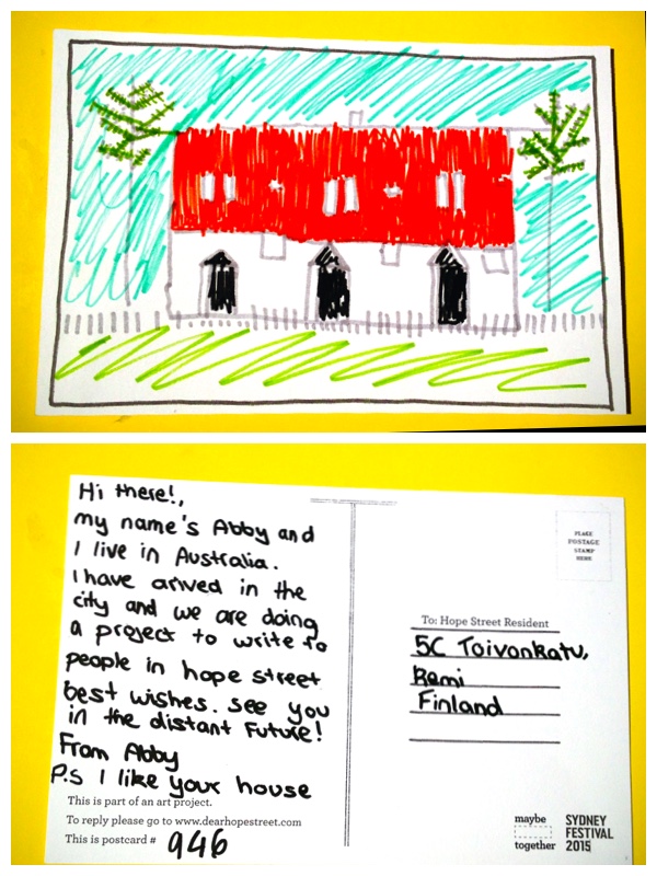 Translation: Terve, olen Abby, ja tulen Australiasta. Olen tullut kaupunkiin ja olemme tekemässä projektia Toivonkadun asukkaille. Parhain terveisin. Nähdään kaukaisessa tulevaisuudessa! T: Abby. Ps pidän talostasi.
