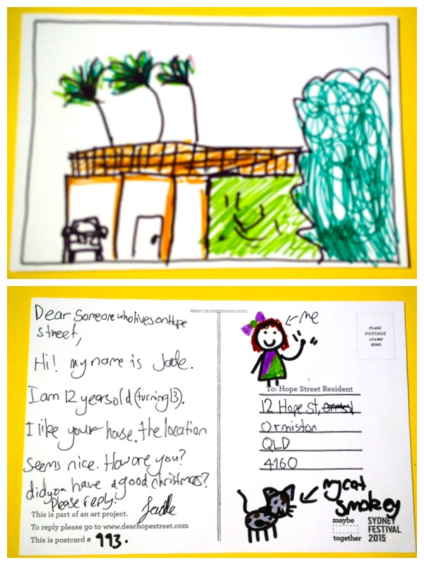 Dear Jade, my name is Lauren. Thank you for your postcard, what a beautiful picture of our house, though we (my husband and two young children) have recently renovated the front and it looks quite different now. We have a cat too, his name is Travis. Our Christmas was a great day, spent eating lots of food and swimming in the pool!