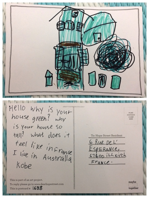hello, thank you for your postcard! I didn’t choose the colour of my house, I bought it 20 years ago with this special green, its an old house built in 1904. At the begining it was a house for two family. But i used to live with my two children and my husband, but now they’re old, my son left the house (he’s 25) and the house is maybe too big for us but I like to live in there. I like to live in France (but I don’t know how it is in australia). At that time it’s summer, it’s very hot (about 30°C) but in winter time it snowing and freezing. How is life in Australia?