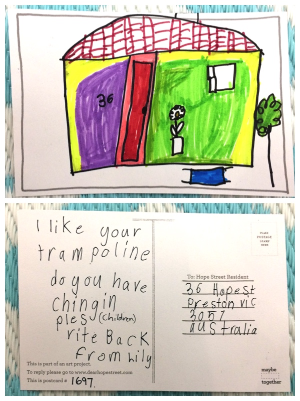 My name is Saul and I’m 6 years old. I live at 36 Hope St. in Preston with my 13 year old sister called Ieva and my mum and dad and my cat named Bell. I am in grade 1 and I go to Bell Primary school. I have half an hour swimming lessons. I like to draw, play on the ipad and play with my friends. It was exciting to get a Post card from Perth. Bye . From Saul & family.