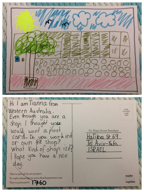 שלום. אני טיאנה ממערב אוסטרליה. אפילו שאתם חנות ולא בית רגיל, חשבתי שתרצו מלקבל גלויה. האם אתם הבעלים של החנות או רק עובדים שם? איזו מין חנות זו? שיהיה לכם יום נעים.