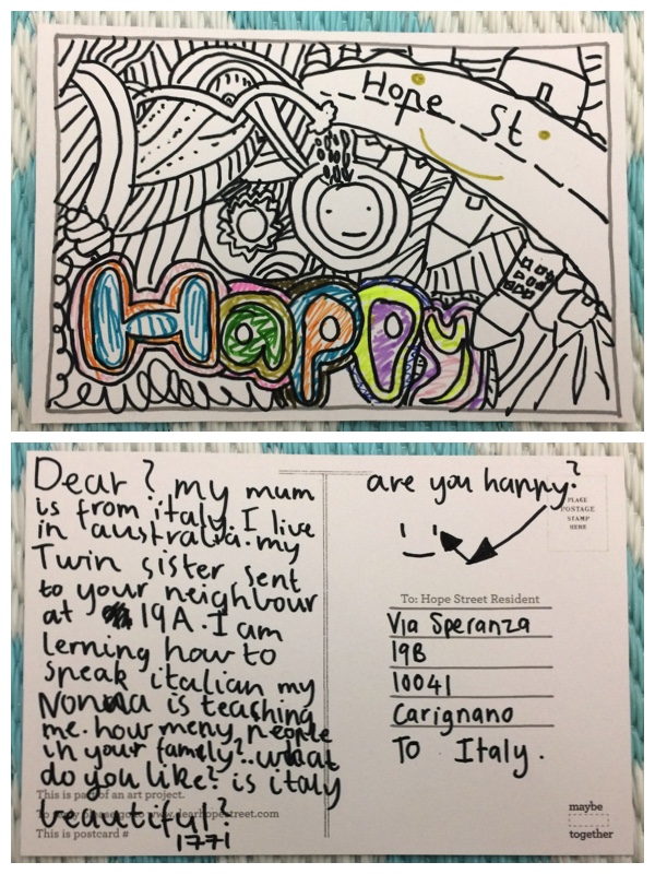 Mia mamma è italiana. Io vivo in Australia. La mia sorella gemella ha spedito (una cartolina) al tuo vicino del 19A. Sto imparando a parlare l’ Italiano. Mia nonna mi sta insegnando. Quanti siete nella vostra familia? Cosa ti piace? È bella l’Italia?