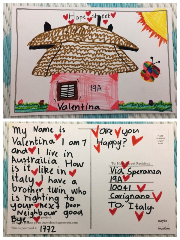 Translation: Il mio nome è Valentina. Ho 7 anni e vivo in Australia. Com’è l’Italia? Ho un fratello gemello che si scrive con il vicino della porta accanto. Ciao.