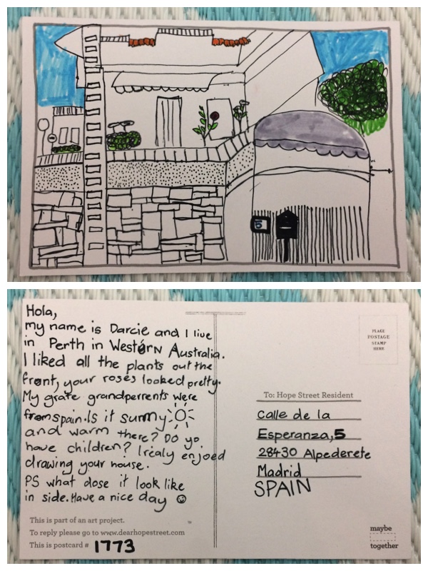 Hola. Mi nombre es Darcie y yo vivo en Perth, Australia Occidental. Me gustaron todas las plantas fuera de tu casa, tus rosas se veían hermosas. Mis bisabuelos eran de España. ¿Es soleado y cálido allí? ¿Tienes hijos? Me gustó mucho dibujar tu casa. PD ¿Qué aspecto tiene el interior? Que tengas un buen día ☺