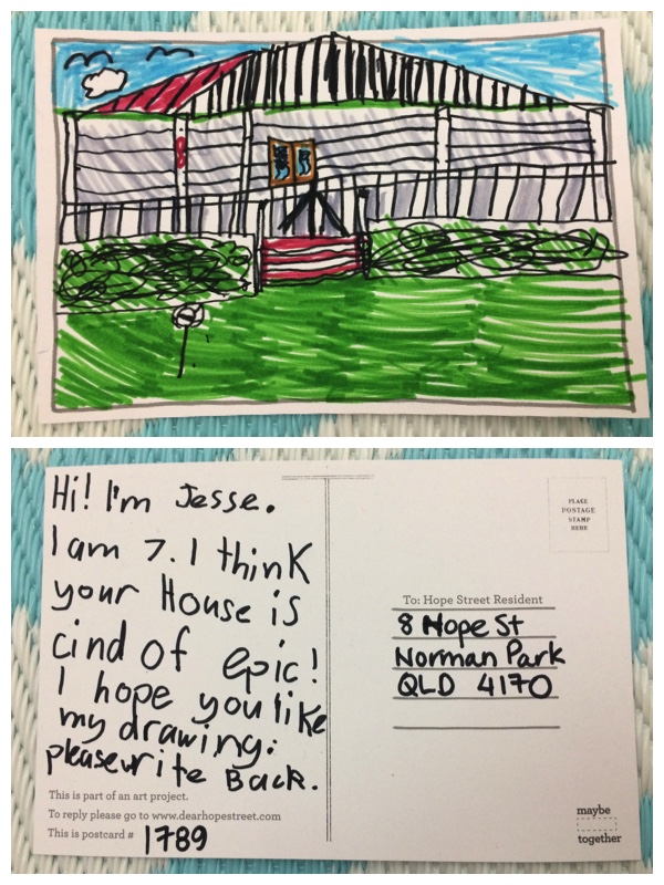 Thank you for the postcard. Your drawing is great and we enjoy looking at on our fridge everyday!