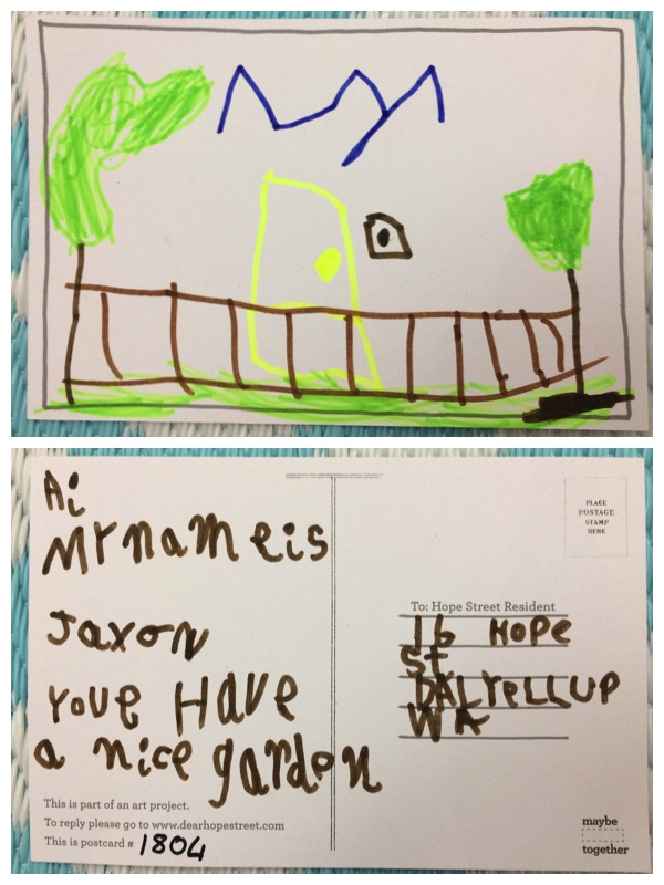 Dear Jaxon, Writing to say thankyou for your postcard. Sorry it’s taken a while to reply, but I’ve been busy in the garden. It was really nice of you to notice the garden as it does take a lot of hard work to keep it looking like this. I really liked the picture you drew of the garden, the front fence and the house.