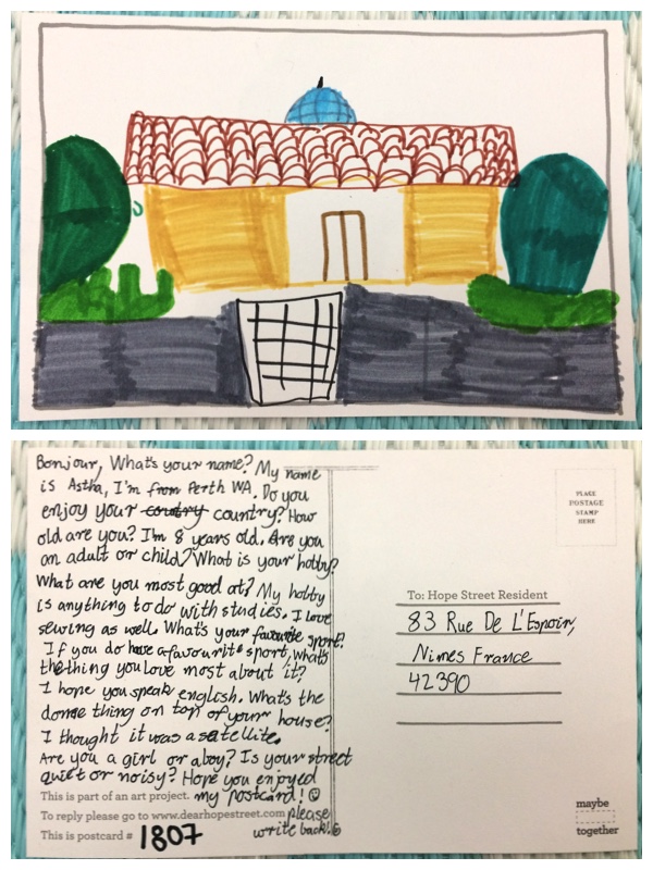 Bonjour, comment vous appelez-vous ? Je m’appelle Astha, je suis originaire de Perth, en Australie occidentale. Aimez- vous votre pays ? Quel âge avez-vous ? J’ai 8 ans. Êtes-vous un adulte ou un enfant ? Quel est votre hobby ? En quoi êtes-vous bon ? Mon hobby est tout ce qui est lié aux études. J’aime aussi coudre. Quel est votre sport préféré ? Quelle est la chose que vous aimez le plus à ce sujet ? J’espère que vous parlez anglais. Qu’est-ce qu’il y a sur le dessus de votre maison ? Je pensais que c’était un satellite. Êtes-vous un garçon ou une fille ? Votre rue est-elle calme ou bruyante ? J’espère que vous avez aimé ma carte postale ! ☺ Veuillez me répondre !