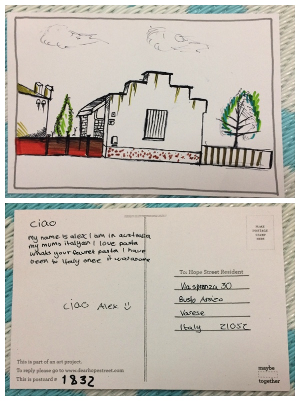 Translation: Ciao. Il mio nome è Alex. Sono in Australia. Mia mamma è Italiana. Amo la pasta. Qual è la tua pasta preferita? Sono stato una volta in Italia. E’ stato impressionante. Ciao Alex ☺