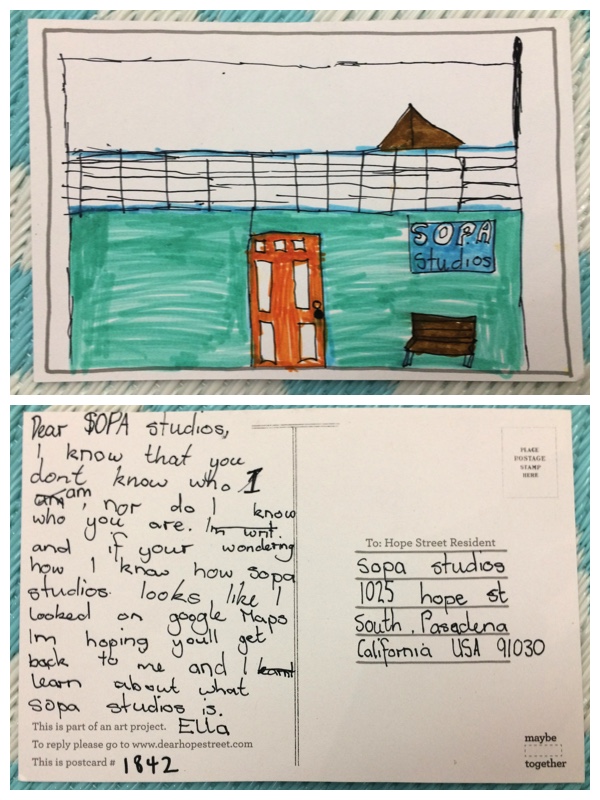 1. Dear Ella: We received your postcard and you did a terrific job on the drawing of the building. SOPA Studios is an artist collective – a group of artists who get together to exhibit our artwork and some of us also teach art workshops. SOPA stands for SOuth PAsadena. We have about 20 members and we create art in all kinds of media: oil and acrylic paint, pen, ink, graphite, collage, and encaustic. If you want to see some of our artwork, go to http://www.SOPAStudios.com. We have just redone our website, so not all of our members’ work is uploaded yet. This is an exciting project and we are happy that you chose our “Hope Street”! Best wishes, All the Artists at SOPA Studios.