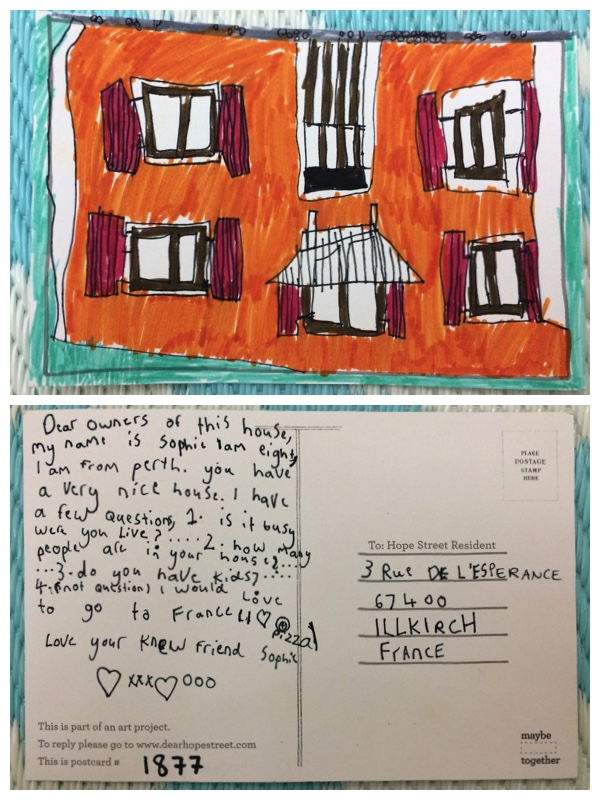 Chers propriétaires de cette maison. Je m’appelle Sophie. J’ai huit ans. Je suis originaire de Perth. Vous avez une maison très agréable. J’ai quelques questions pour vous. 1. Est-il très fréquenté où vous vivez ? 2. Combien de personnes vivent chez vous ? 3. Avez-vous des enfants ? 4. (pas une question) J’aimerais aller en France. J’aime la pizza. Bisous, votre nouvelle amie, Sophie xxxx oooo
